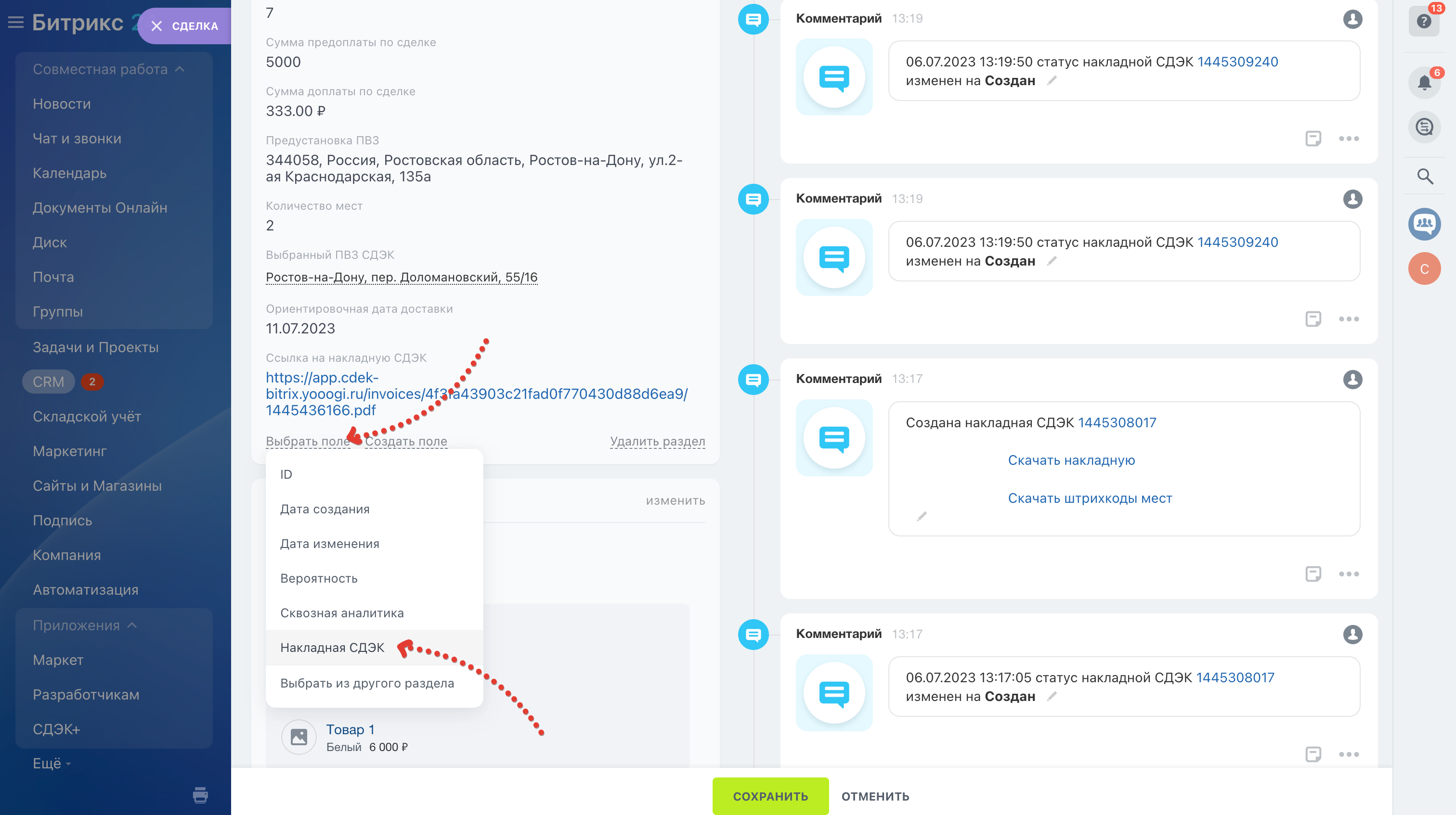 Опция позволяет транслировать ссылку на накладную СДЭК в доп. поле сделки. При повторном создании накладной для одного и того же документа, ссылка будет заменена новой.
