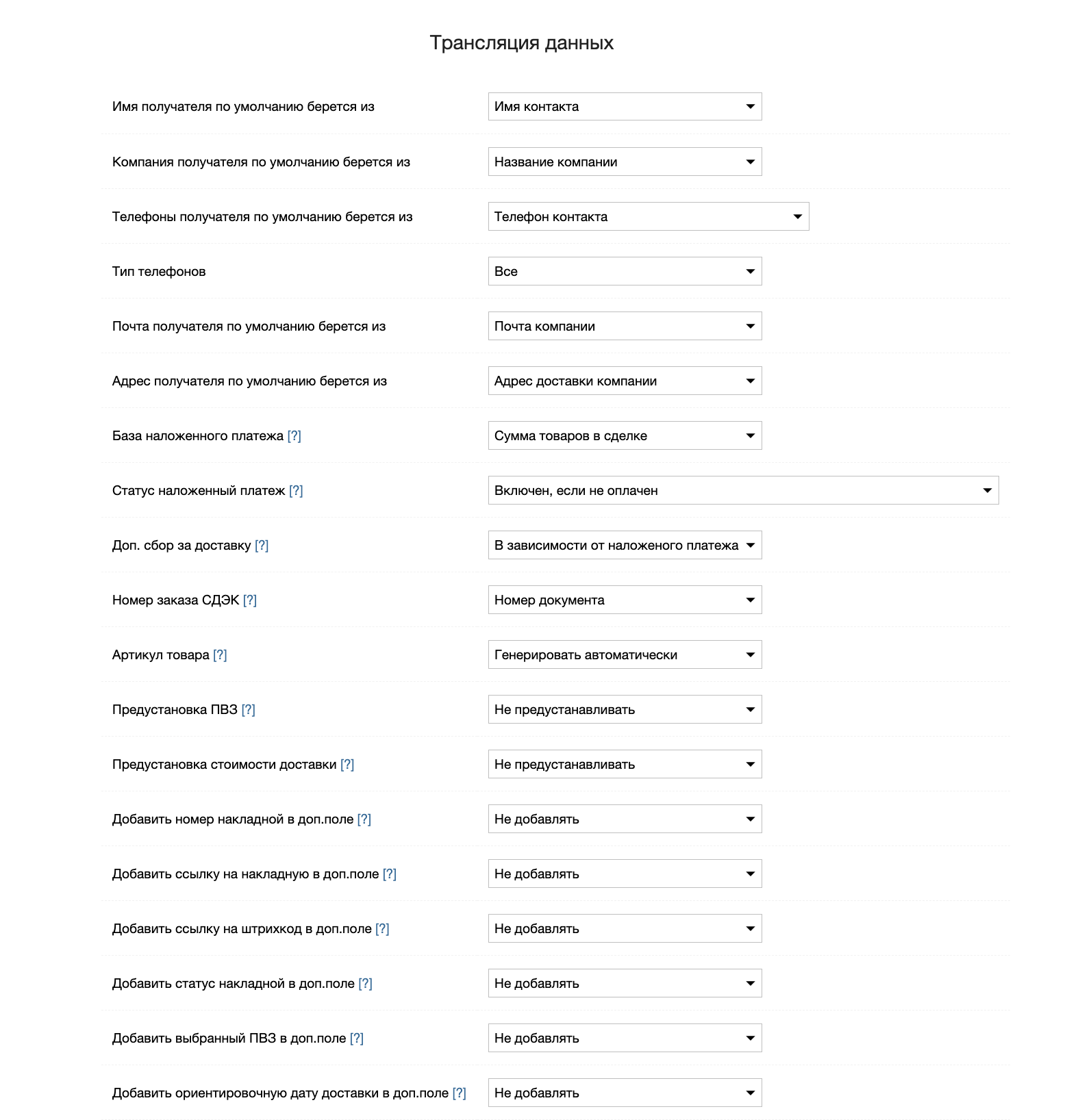 Этот раздел позволяет настроить работу приложения (выбор данных клиента, трансляцию статусов из СДЭК, передачу данных накладных в доп. поля).