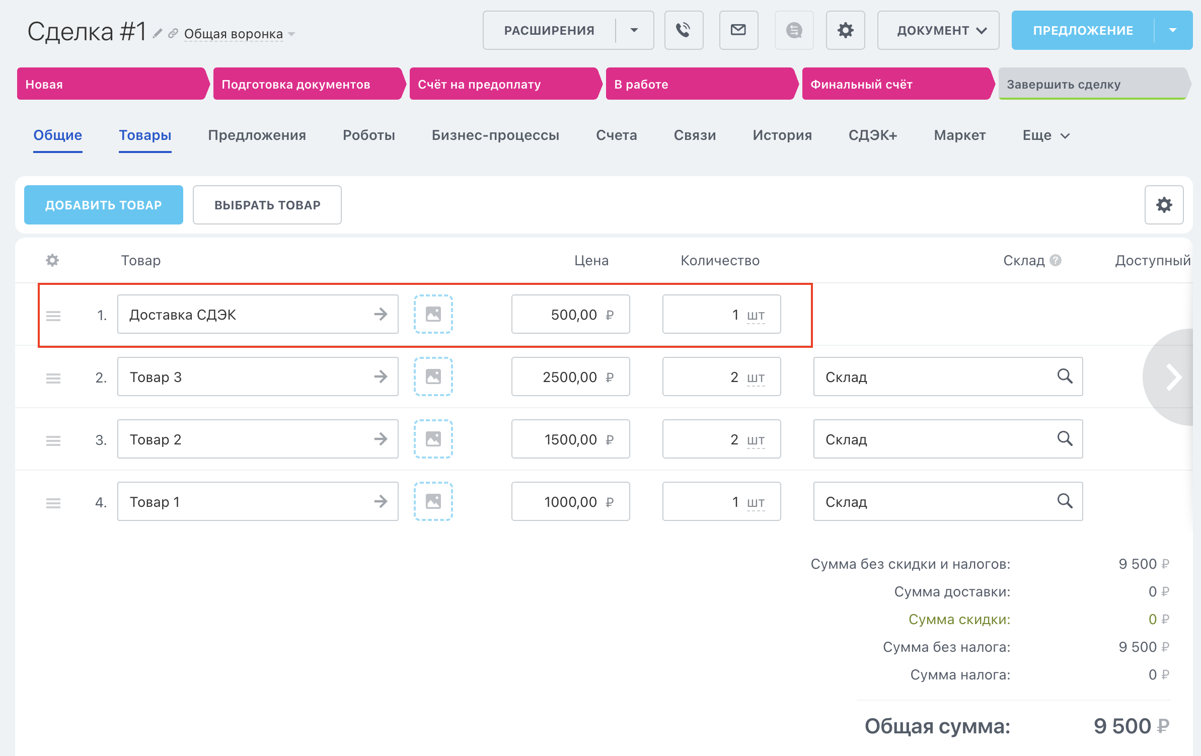 - из стоимости услуги. Если в списке товаров сделки имеется выбранная услуга, приложение автоматически назначит стоимость сбора за доставку из стоимости данной услуги