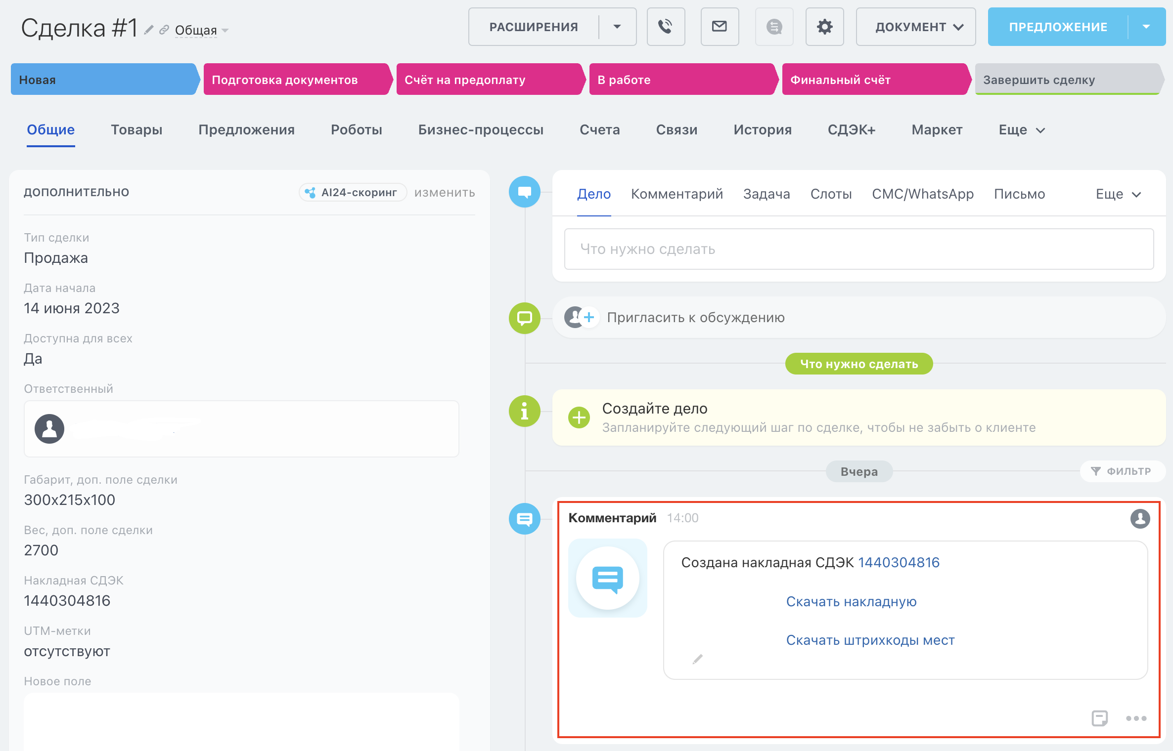 Опция добавит сообщение о создании накладной с ссылками на накладную и штрихкоды накладной в живую ленту