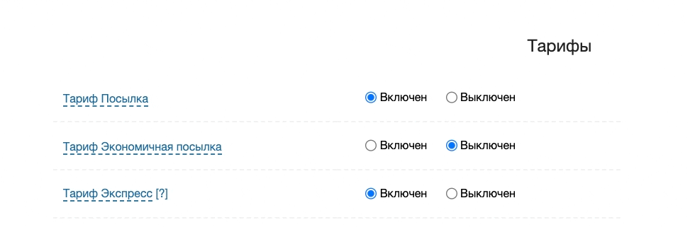 В данном разделе пользователь может включить нужные тарифы для расчета. Стоит заметить, что некоторые тарифы могут быть недоступны клиенту, или ограничены по региону доставки.