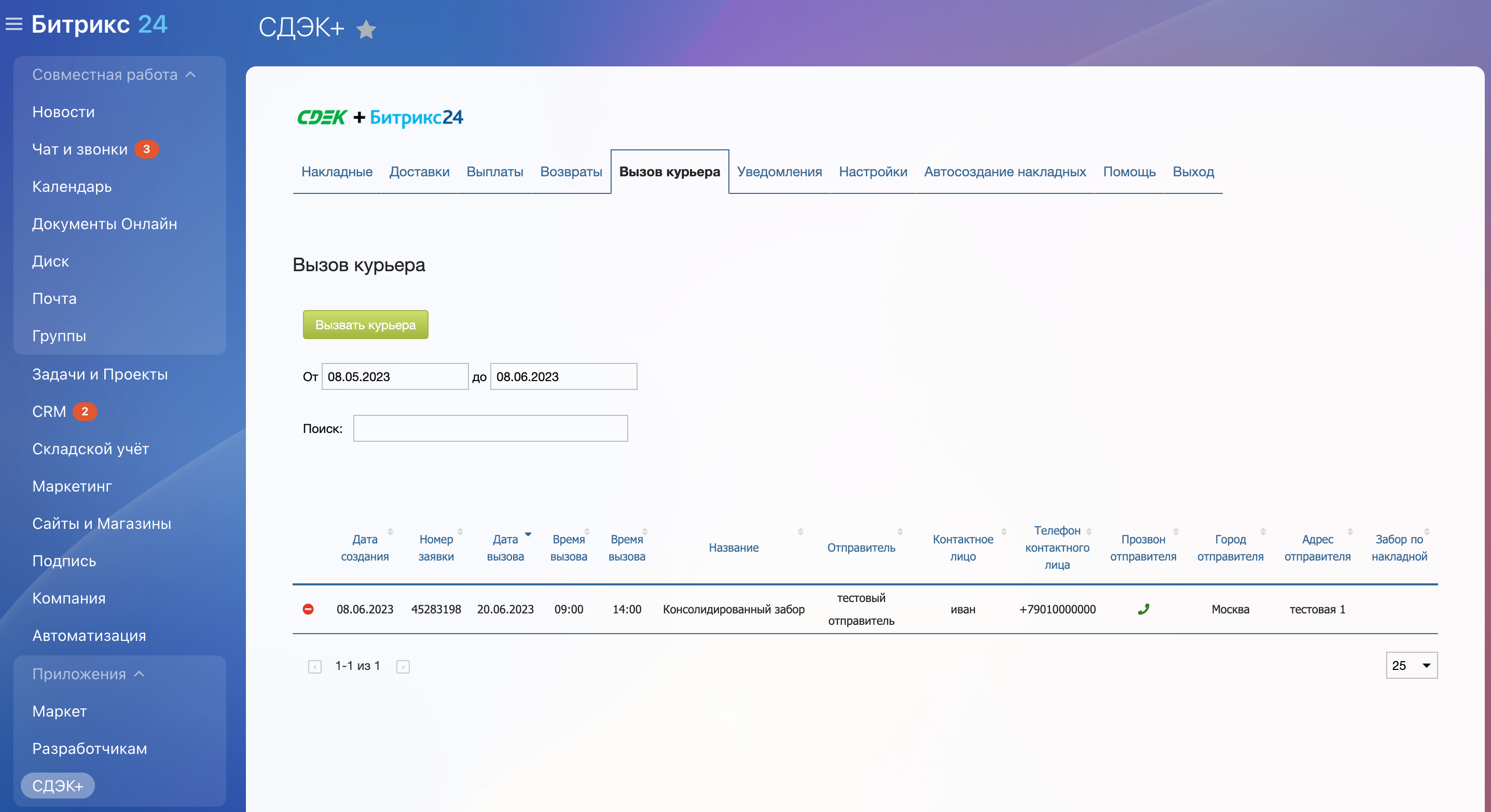 В интерфейсе доступна фильтрация заявок на вызов курьера по дате, а также поиск по полям вызова.
