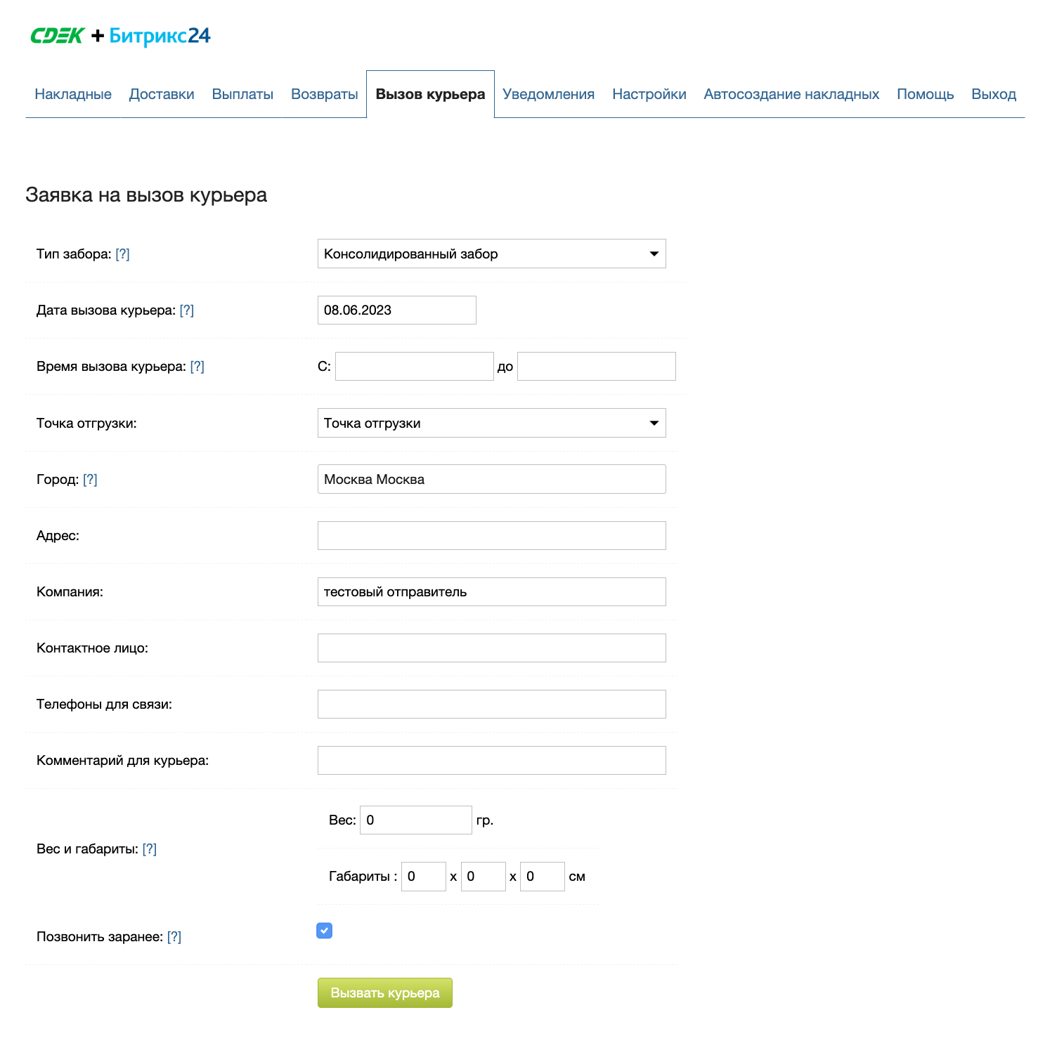 Ваша точка отгрузки СДЭК (договор), от которого будет вызываться курьер. При смене точки отгрузки контактные данные в форме вызова курьера поменяются автоматически.