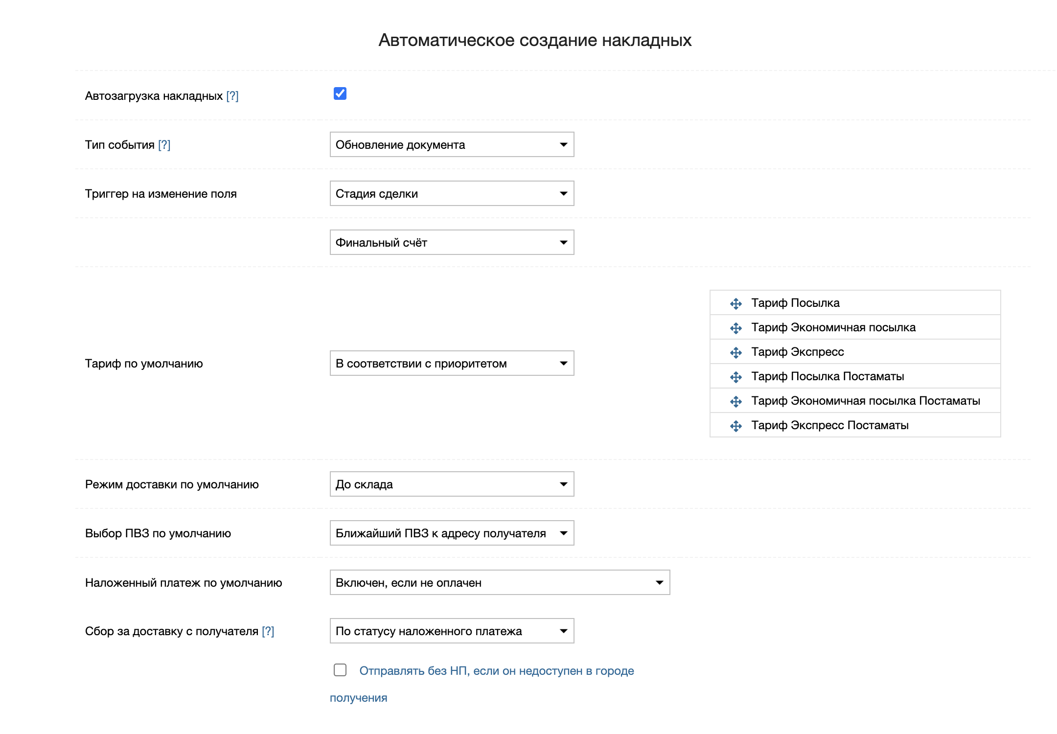 - включен, если не оплачен. Если сумма оплаченных счетов по сделке меньше базы наложенного платежа, то автоматически включается наложенный платеж в виде полной суммы базы наложенного платежа