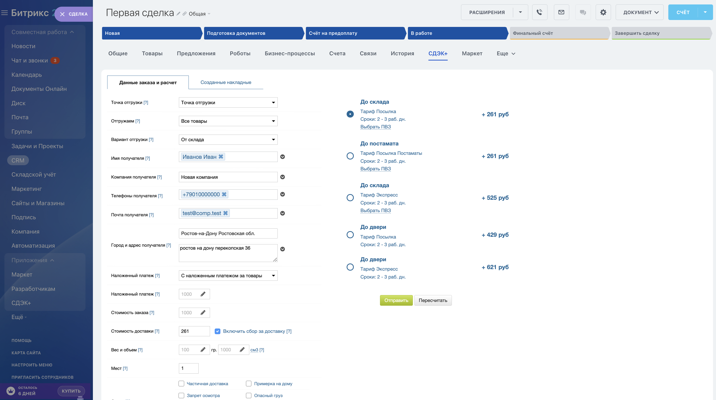 В правой области пользователю предлагается выбрать подходящий тариф, ПВЗ (если отправление до склада), и сформировать накладную и штрихкоды мест.